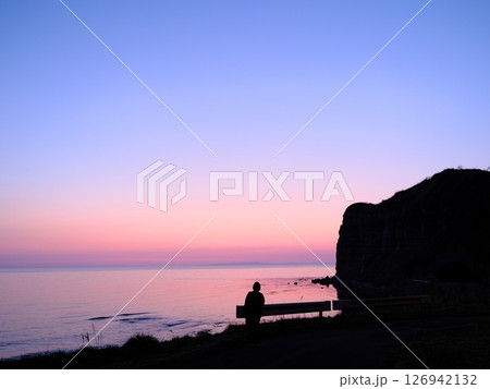 北海道爾志郡乙部町 館の岬駐車場 マジックアワーの夕暮れに佇む人