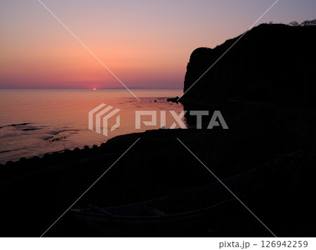 北海道爾志郡乙部町 館の岬駐車場から夕日と東洋のグランドキャニオンと言われる地層郡を臨む