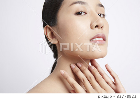 The portrait of a Thai woman putting hand on her neck