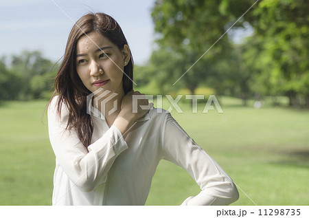 The portrait of a Thai woman putting hand on her neck