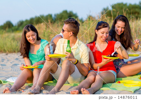 smiling friends sitting on summer beach