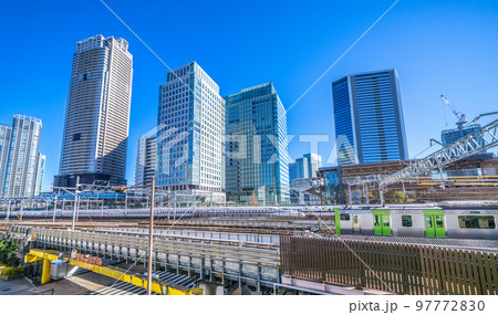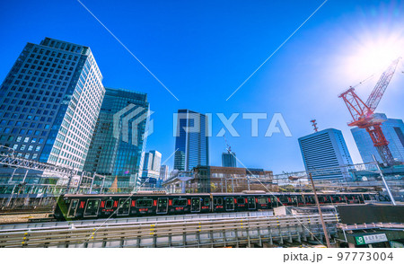 日本の東京都市景観 浜松町駅前(北口)から黒い山手線や超高層ビル群などを望む