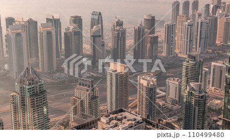 JLT skyscrapers and marina towers near Sheikh Zayed Road aerial timelapse during sunrise. Residential buildings