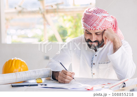 Arab construction engineer builder architect building designer working sketch design house floor plan