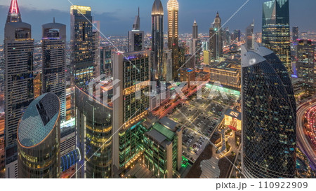 Skyline view of the high-rise buildings on Sheikh Zayed Road in Dubai aerial day to night timelapse, UAE.