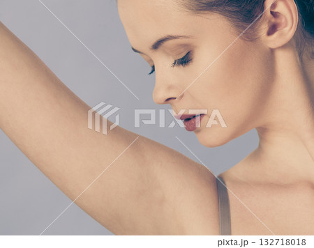 Woman apply deodorant to armpits. Everyday hygiene procedure