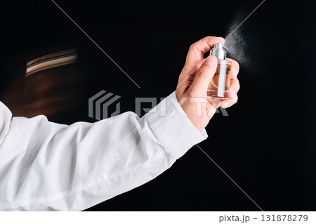 A hand in a white shirt sprays perfume or air freshener. Black background.
