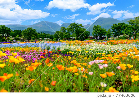 観光客 香る花の村 最高に美しい晴天空を背景に春彩畑 日本・九州・大分県竹田市
