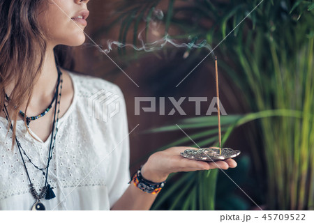incense stick smokes on a wooden stand on a dark background. Aromatherapy, Smoke while burning incense. smoke for prayers and meditation. prayer to buddha. incense for relaxation and yoga
