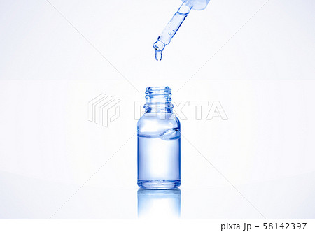 Liquid serum drop from pipette into a cosmetic transparent glass bottle