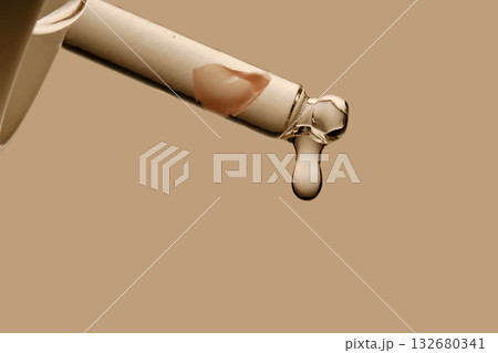 A juicy drop of serum hangs on the pipette, demonstrating the texture of the cosmetic product.