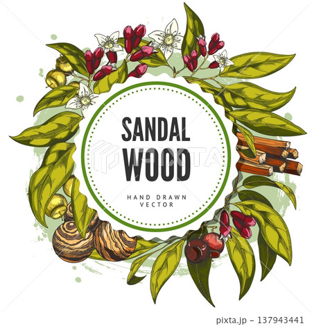 Sandalwood tree leaves, flowers, seeds with fragrant sticks engraved sketch, vector round label design organic products