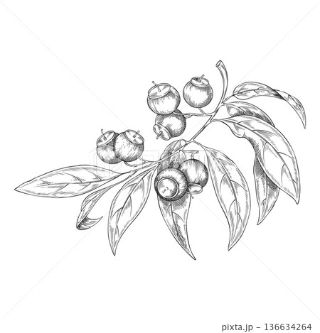 Sandalwood branch with leaves and berries, monochrome hand sketch.