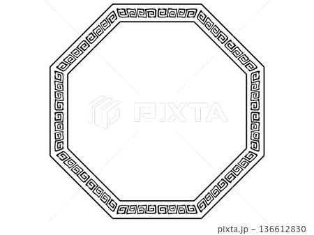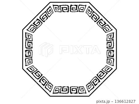 中華風フレーム。筆タッチの手描き雷紋。黒の八角形。