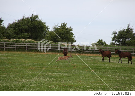 馬と野生の鹿がいる風景_日髙