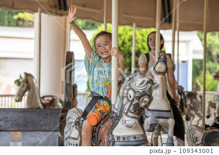 メリーゴーランドに乗ってはしゃぐ女の子と母親
