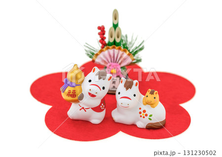 午年 年賀素材 かわいい午の親子 梅の花びらバック