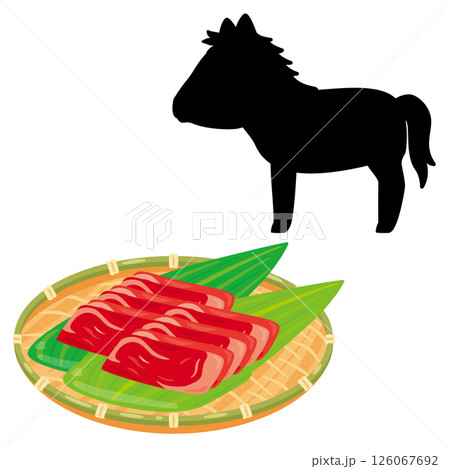 ザルに盛られた馬刺しとウマのシルエットイラスト