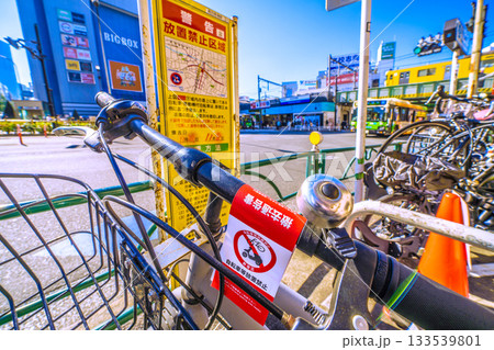 日本の東京都市景観 高田馬場駅や撤去通告書が貼られた放置自転車などを望む=11月21日