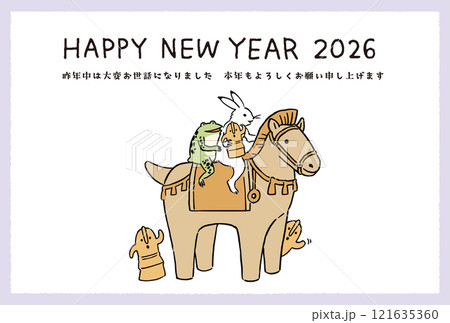 2026年 年賀状 鳥獣戯画 うさぎとカエルが馬形埴輪に乗って遊ぶイラストレーション