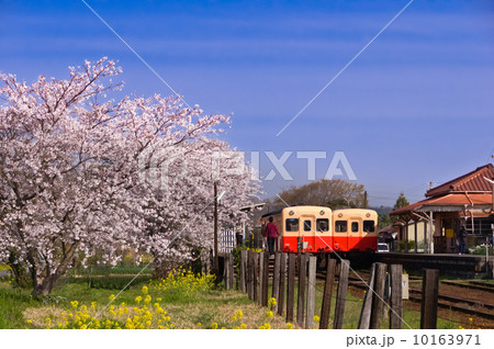 菜の花と桜が咲く春の小湊鉄道ホームにディーゼルカーが到着