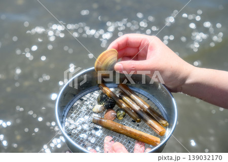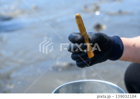 潮干狩りでマテ貝を網で掬う女性の手