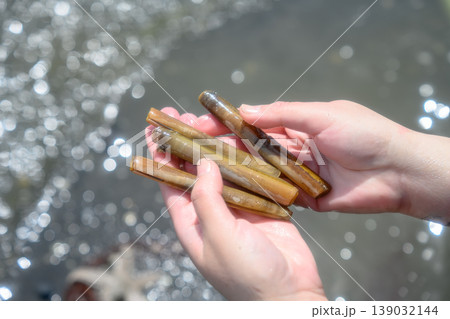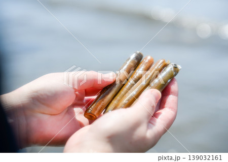 潮干狩りで採れたマテ貝を両手で持つ女性の手