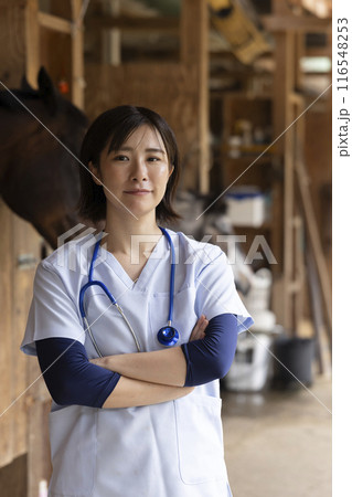 smiling asian female veterinarian standing with horse stable