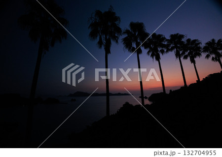 太平洋日向灘の日南海岸贄波浜の星空に昇る日出で黄昏色に染まったと鳥帽子島に松島と黒島