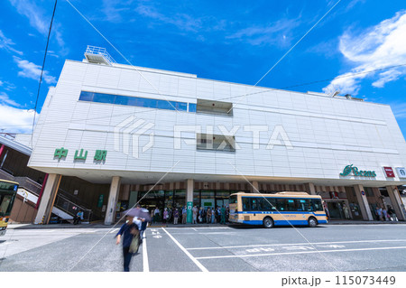 日本の横浜都市景観 横浜市緑区の中山駅前。中山商店街などを望む