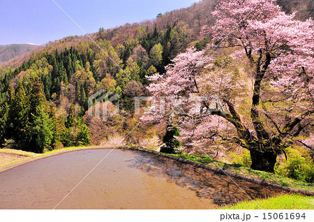 水田に映る駒つなぎの桜 長野県阿智村