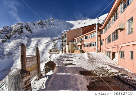 冬の長野県駒ヶ根市 千畳敷カールからホテル千畳敷、ロープウェイ駅方面を見る