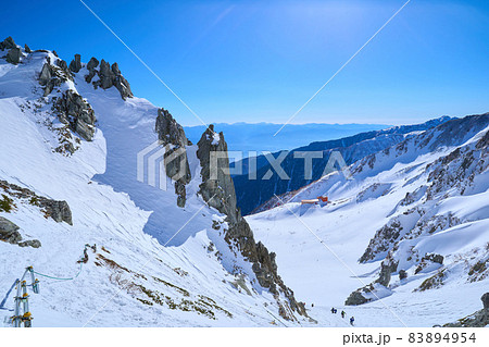 冬の長野県駒ヶ根市 千畳敷カールの八丁坂付近からカール、ホテル千畳敷方面を見る