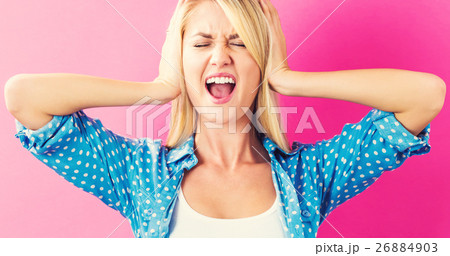 耳を塞ぐ若い女性