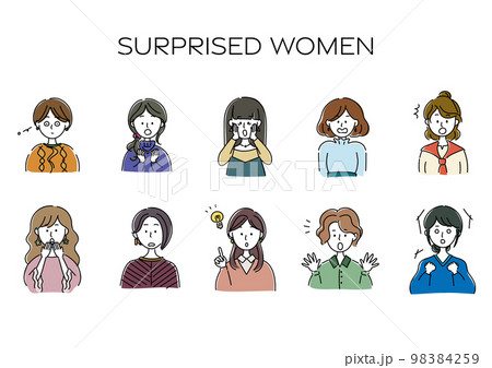 驚く、発見、びっくりする女性のアバター、シンプルなアイコンセット