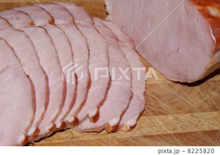 Sliced cured sirloin pork on wooden cuting board