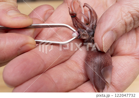 ほたるいかの下処理、目、、口、軟甲を取り除く