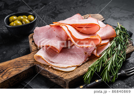 Pork ham slices on cutting board, Italian Prosciutto cotto. Black background. Top view