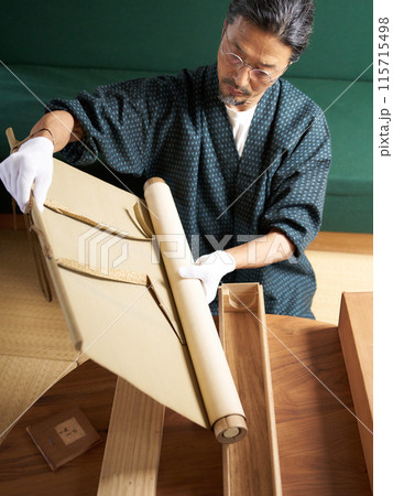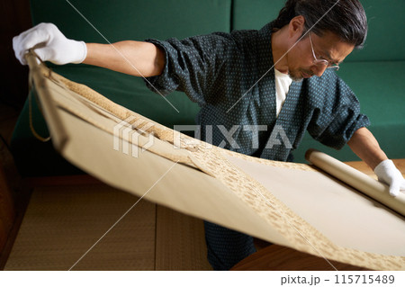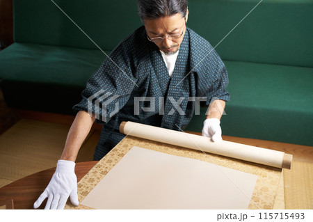 掛軸を広げて確認する和服の男性 鑑定士 古物商 収集家 イメージ
