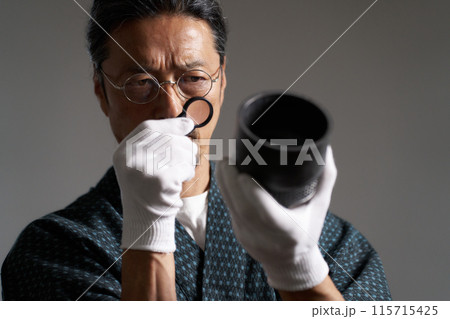 陶磁器をルーペで確認する和服の男性 鑑定家 イメージ