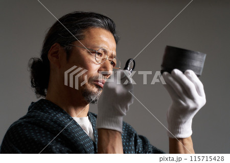 陶磁器を見つめる和服の男性 陶芸家 鑑定家 イメージ