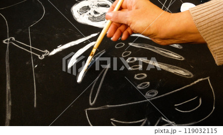 Hand paints skeleton with white paint brush on black suit. Preparing for Halloween.