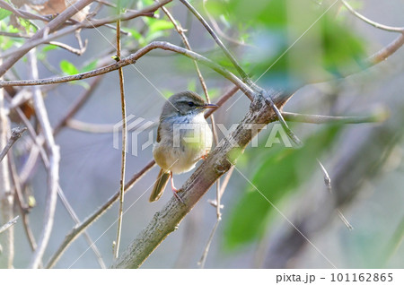 緑の公園の森で高らかに美しい声で囀る身近な野鳥ウグイス