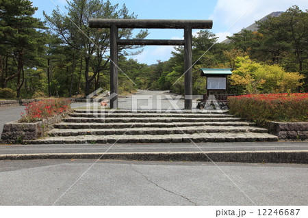 霧島市 高千穂河原の霧島神宮古宮址入口鳥居と霧島山御鉢