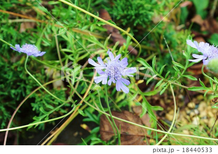 秋の野の花・訪れる清しい秋の色の松虫草の花三つ・横位置