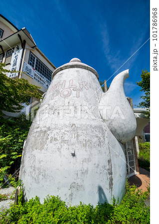 復活したミルクポットと清里の町並み