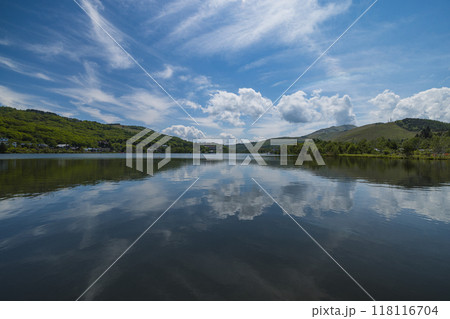 日本 長野県北佐久郡立科町にある白樺湖の水面に鏡面反射する青空
