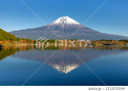 静岡県富士宮市佐折 朝霧高原の田貫湖から望む冠雪した世界遺産富士山と湖面の逆さ富士