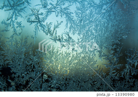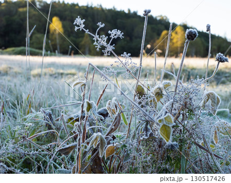 Frozen moss 放射冷却効果で氷点下に冷え込んだ早朝の朝霜に凍る苔の接写クローズアップ撮影