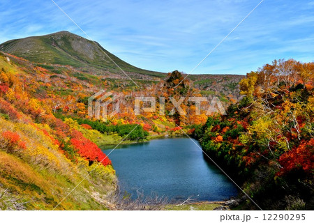 日本百名山 草紅葉映える秋の八幡平 鏡沼